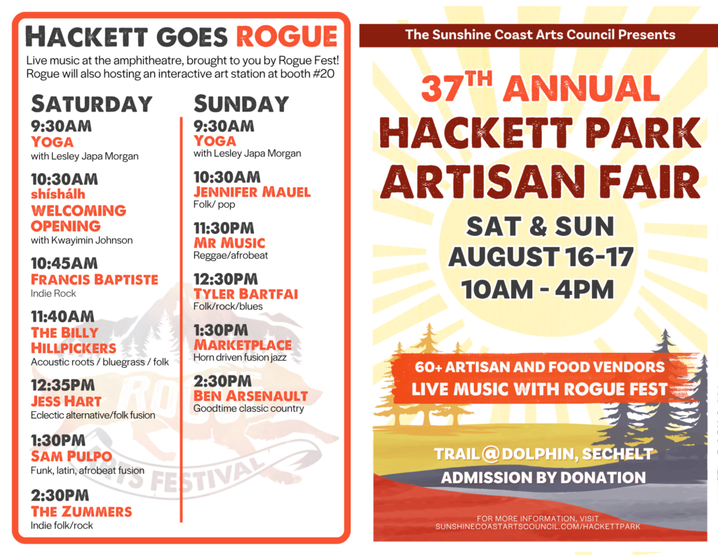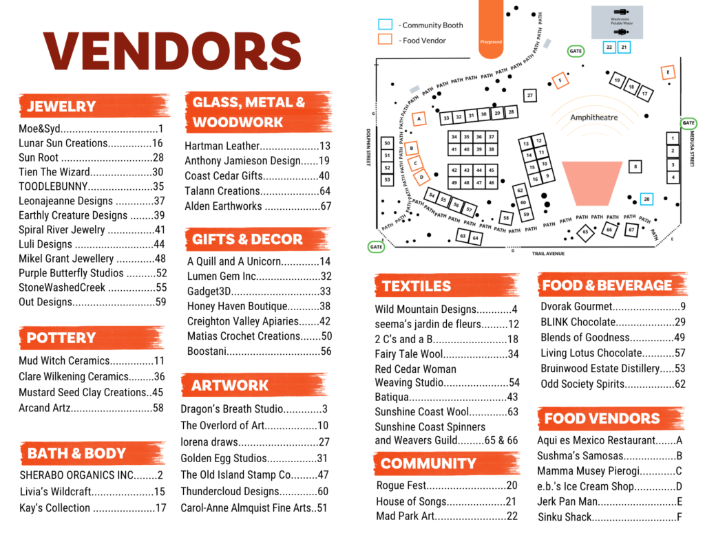 The Fair can be accessed via Medusa Street and at the corner of Trail Ave. and Dolphin St. in Sechelt. Admission is by donation for adults, students and seniors, and free for children under twelve.