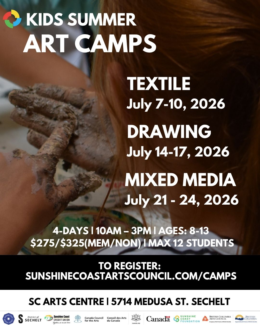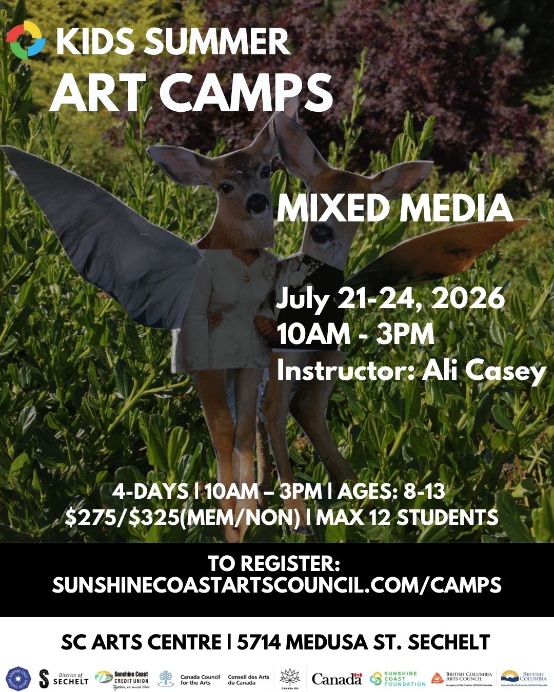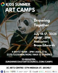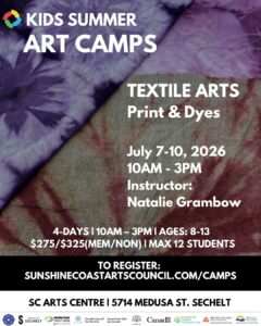 Our camps bring young artists together with professional artists to learn skills such as textiles and fibre, mixed media, and drawing. Participants will learn and make art in our beautiful studio for most of the day, with breaks outdoors exploring the natural spaces near the Arts Centre. Camp runs 10:00am – 3:00pm each day, with a break provided for lunch. Participants must bring their own lunch and a water bottle!