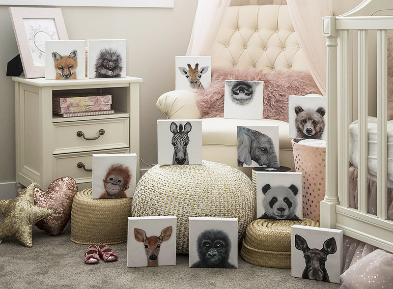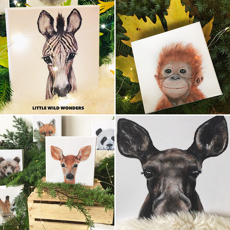 A heartwarming family of 12 animal portraits on canvas, each canvas has been hand stretched onto a 7×7 wood frame and comes ready to hang.
